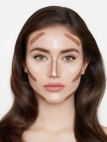 Desliza el tono más intenso a lo largo de los contornos naturales del rostro, incluidos la frente, los pómulos y la línea de la mandíbula, luego aplica el tono más claro para resaltar los puntos más altos del rostro, incluidos debajo de los ojos, la mitad de la frente y el mentón.